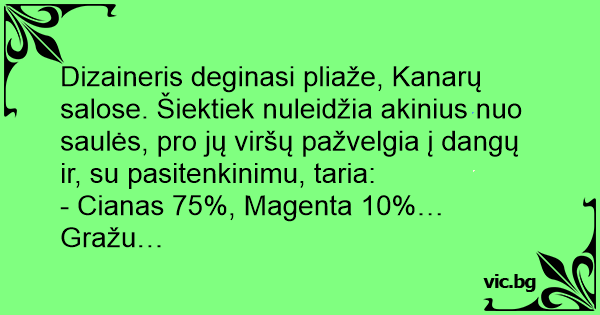 Dizaineris deginasi pliaže, Kanarų salose. Šiektiek nuleidžia akinius nuo saulės, pro jų viršų pažvelgia į dangų ir, su pasitenkinimu, taria: