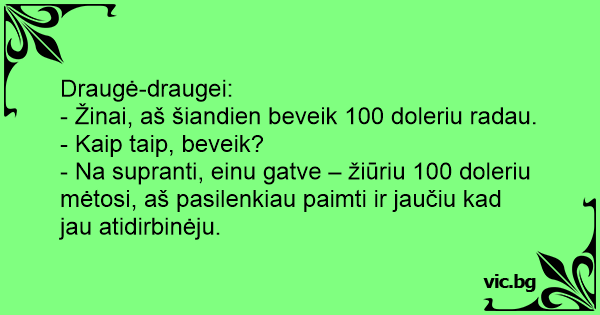 - Na supranti, einu gatve – žiūriu 100 doleriu mėtosi, aš pasilenkiau paimti ir jaučiu kad jau atidirbinėju.