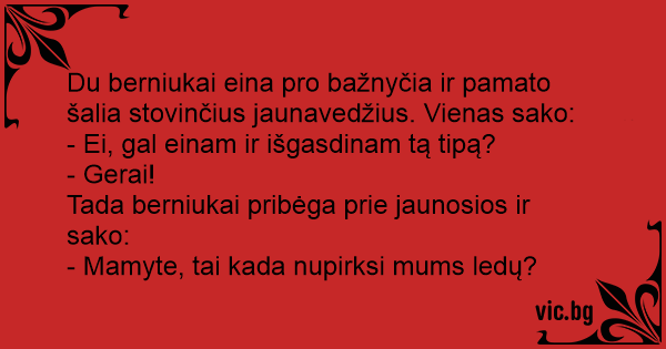 Du berniukai eina pro bažnyčia ir pamato šalia stovinčius jaunavedžius. Vienas sako: