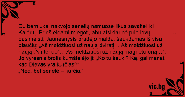 Du berniukai nakvojo senelių namuose likus savaitei iki Kalėdų. Prieš eidami miegoti, abu atsiklaupė prie lovų pasimelsti. Jaunesnysis pradėjo maldą, šaukdamas iš visų plaučių: „Aš meldžiuosi už naują dviratį… Aš meldžiuosi už naują „Nintendo“… Aš meldžiuosi už naują magnetofoną…“. Jo vyresnis brolis kumštelėjo jį: „Ko tu šauki? Ką, gal manai, kad Dievas yra kurčias?“