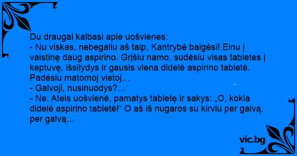 - Nu viskas, nebegaliu aš taip. Kantrybė baigėsi! Einu į vaistinę daug aspirino. Grįšiu namo, sudėsiu visas tabletes į keptuvę, išsilydys ir gausis viena didelė aspirino tabletė. Padėsiu matomoj vietoj…