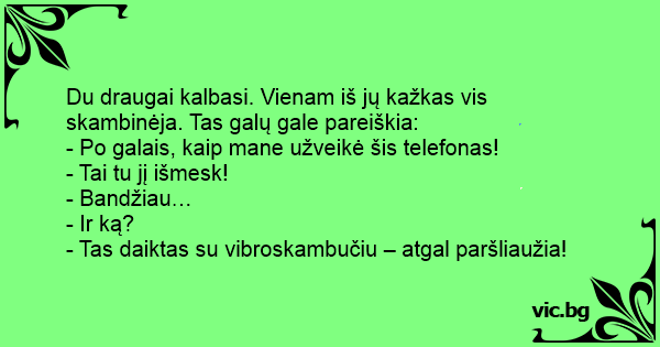 Du draugai kalbasi. Vienam iš jų kažkas vis skambinėja. Tas galų gale pareiškia: