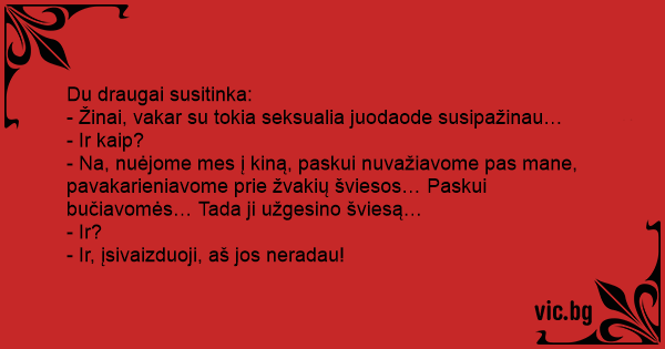 - Na, nuėjome mes į kiną, paskui nuvažiavome pas mane, pavakarieniavome prie žvakių šviesos… Paskui bučiavomės… Tada ji užgesino šviesą…