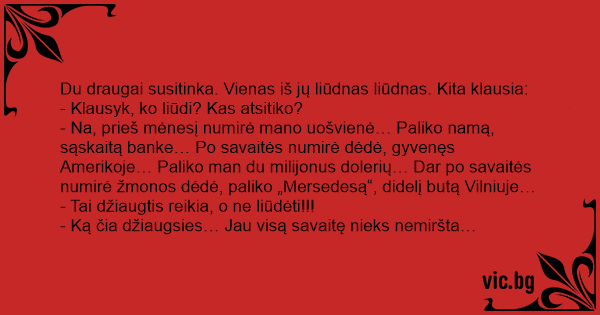 - Na, prieš mėnesį numirė mano uošvienė… Paliko namą, sąskaitą banke… Po savaitės numirė dėdė, gyvenęs Amerikoje… Paliko man du milijonus dolerių… Dar po savaitės numirė žmonos dėdė, paliko „Mersedesą“, didelį butą Vilniuje…