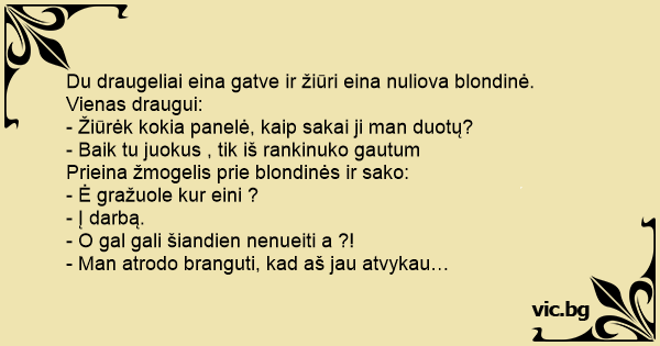 Du draugeliai eina gatve ir žiūri eina nuliova blondinė. Vienas draugui: