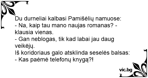 - Na, kaip tau mano naujas romanas? - klausia vienas.