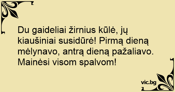 Du gaideliai žirnius kūlė, jų kiaušiniai susidūrė! Pirmą dieną mėlynavo, antrą dieną pažaliavo. Mainėsi visom spalvom!
