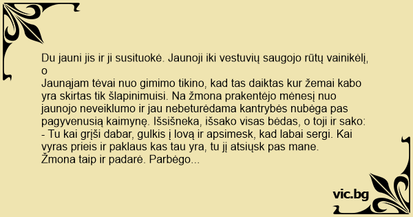 Jaunąjam tėvai nuo gimimo tikino, kad tas daiktas kur žemai kabo yra skirtas tik šlapinimuisi. Na žmona prakentėjo mėnesį nuo jaunojo neveiklumo ir jau nebeturėdama kantrybės nubėga pas pagyvenusią kaimynę. Išsišneka, išsako visas bėdas, o toji ir sako: