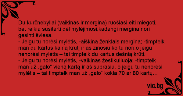 - Jeigu tu norėsi mylėtis, -vaikinas žestikuliuoja; -timptelk man už „galo“ vieną kartą ir aš suprasiu, o jeigu tu nenorėsi mylėtis – tai timptelk man už „galo“ kokia 70 ar 80 kartų…