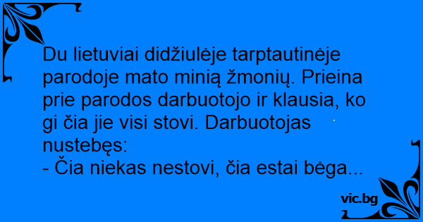 Du lietuviai didžiulėje tarptautinėje parodoje mato minią žmonių. Prieina prie parodos darbuotojo ir klausia, ko gi čia jie visi stovi. Darbuotojas nustebęs: