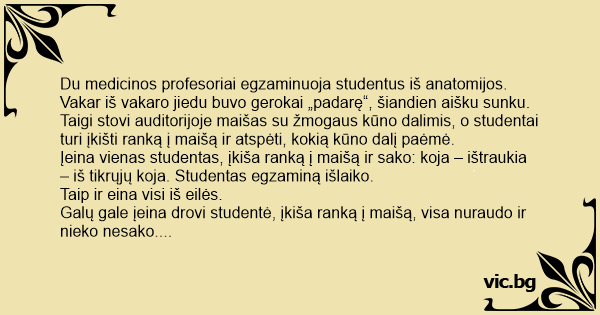 Įeina vienas studentas, įkiša ranką į maišą ir sako: koja – ištraukia – iš tikrųjų koja. Studentas egzaminą išlaiko.
