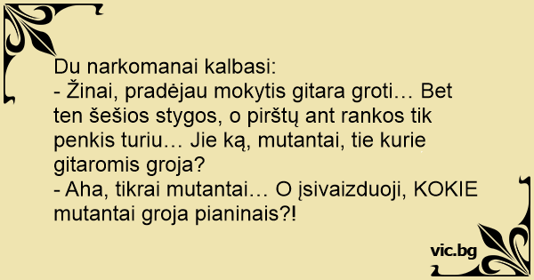 - Žinai, pradėjau mokytis gitara groti… Bet ten šešios stygos, o pirštų ant rankos tik penkis turiu… Jie ką, mutantai, tie kurie gitaromis groja?