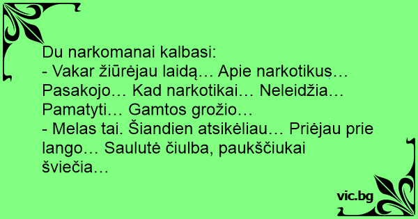 - Vakar žiūrėjau laidą… Apie narkotikus… Pasakojo… Kad narkotikai… Neleidžia… Pamatyti… Gamtos grožio…