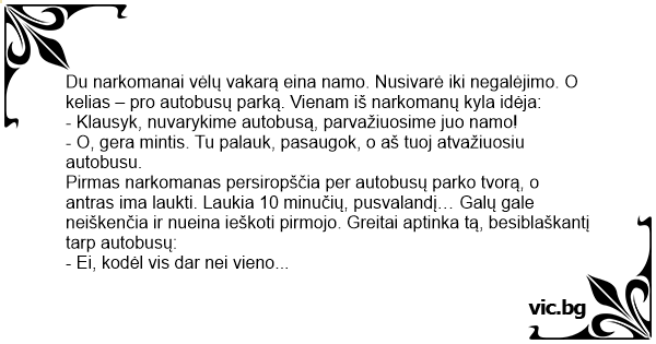 Pirmas narkomanas persiropščia per autobusų parko tvorą, o antras ima laukti. Laukia 10 minučių, pusvalandį… Galų gale neiškenčia ir nueina ieškoti pirmojo. Greitai aptinka tą, besiblaškantį tarp autobusų: