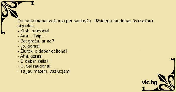 Du narkomanai važiuoja per sankryžą. Užsidega raudonas šviesoforo signalas: