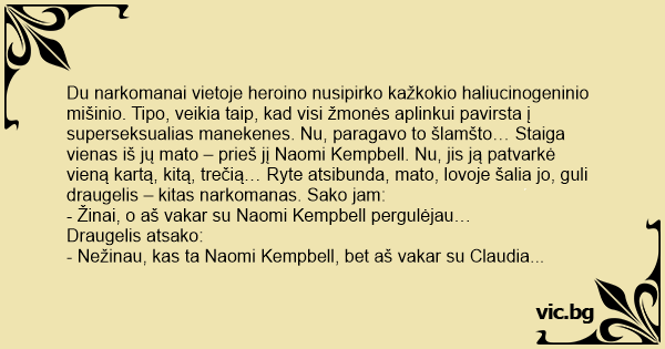 Du narkomanai vietoje heroino nusipirko kažkokio haliucinogeninio mišinio. Tipo, veikia taip, kad visi žmonės aplinkui pavirsta į superseksualias manekenes. Nu, paragavo to šlamšto… Staiga vienas iš jų mato – prieš jį Naomi Kempbell. Nu, jis ją patvarkė vieną kartą, kitą, trečią… Ryte atsibunda, mato, lovoje šalia jo, guli draugelis – kitas narkomanas. Sako jam: