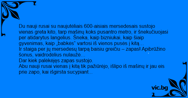 Du nauji rusai su naujutėliais 600-aisiais mersedesais sustojo vienas greta kito, tarp mašinų koks pusantro metro, ir šnekučiuojasi per atidarytus langelius. Šneka, kaip bizniukai, kaip šiaip gyvenimas, kaip „babkės“ vartosi iš vienos pusės į kitą…
