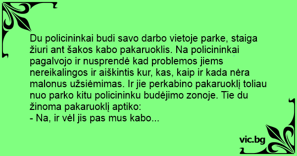 Du policininkai budi savo darbo vietoje parke, staiga žiuri ant šakos kabo pakaruoklis. Na policininkai pagalvojo ir nusprendė kad problemos jiems nereikalingos ir aiškintis kur, kas, kaip ir kada nėra malonus užsiėmimas. Ir jie perkabino pakaruoklį toliau nuo parko kitu policininku budėjimo zonoje. Tie du žinoma pakaruoklį aptiko: