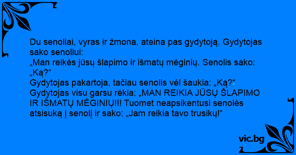 Gydytojas pakartoja, tačiau senolis vėl šaukia: „Ką?“ Gydytojas visu garsu rėkia: „MAN REIKIA JŪSŲ ŠLAPIMO IR IŠMATŲ MĖGINIŲ!!! Tuomet neapsikentusi senolės atsisuką į senolį ir sako: „Jam reikia tavo trusikų!“