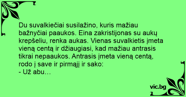 Du suvalkiečiai susilažino, kuris mažiau bažnyčiai paaukos. Eina zakristijonas su aukų krepšeliu, renka aukas. Vienas suvalkietis įmeta vieną centą ir džiaugiasi, kad mažiau antrasis tikrai nepaaukos. Antrasis įmeta vieną centą, rodo į save ir pirmąjį ir sako: