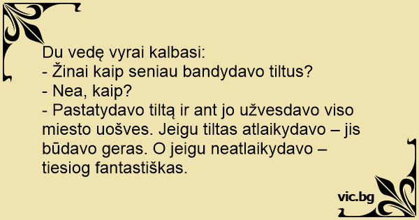 - Pastatydavo tiltą ir ant jo užvesdavo viso miesto uošves. Jeigu tiltas atlaikydavo – jis būdavo geras. O jeigu neatlaikydavo – tiesiog fantastiškas.