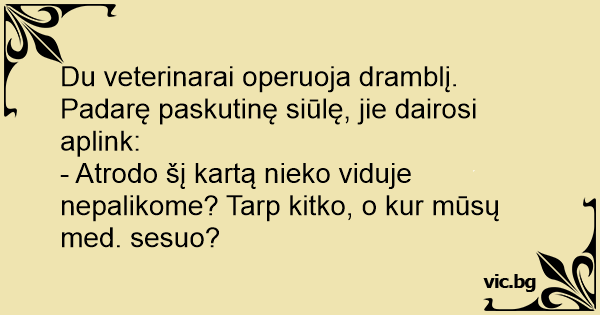 Du veterinarai operuoja dramblį. Padarę paskutinę siūlę, jie dairosi aplink: