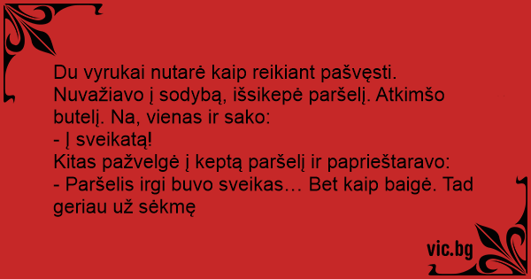 Du vyrukai nutarė kaip reikiant pašvęsti. Nuvažiavo į sodybą, išsikepė paršelį. Atkimšo butelį. Na, vienas ir sako: