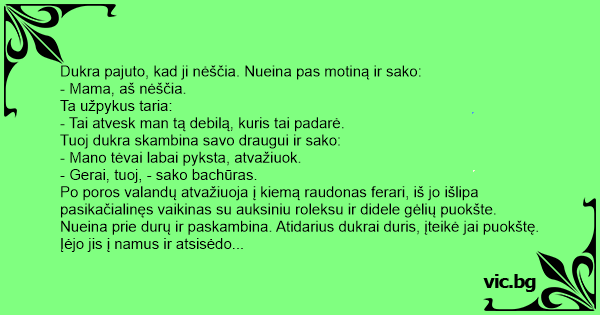 Tuoj dukra skambina savo draugui ir sako: