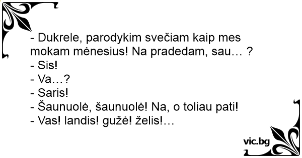 - Dukrele, parodykim svečiam kaip mes mokam mėnesius! Na pradedam, sau… ?