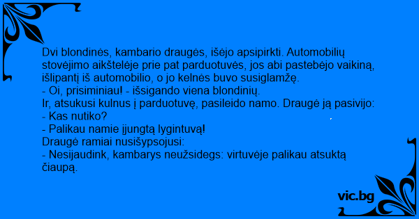 Dvi blondinės, kambario draugės, išėjo apsipirkti. Automobilių stovėjimo aikštelėje prie pat parduotuvės, jos abi pastebėjo vaikiną, išlipantį iš automobilio, o jo kelnės buvo susiglamžę.