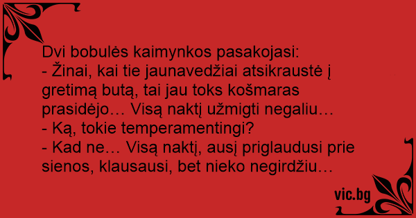 - Žinai, kai tie jaunavedžiai atsikraustė į gretimą butą, tai jau toks košmaras prasidėjo… Visą naktį užmigti negaliu…