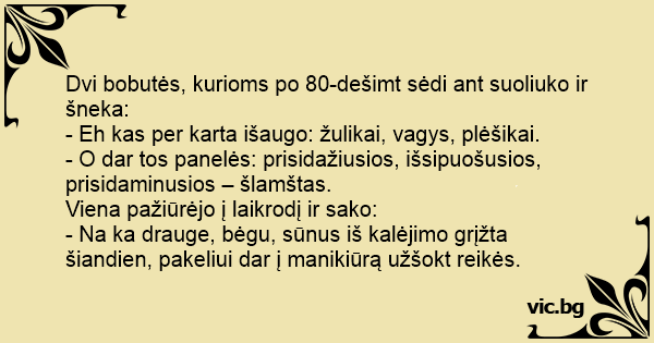 Dvi bobutės, kurioms po 80-dešimt sėdi ant suoliuko ir šneka: