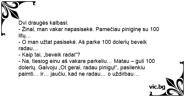 - Na, tiesiog einu aš vakare parkeliu… Matau – guli 100 dolerių. Galvoju „Ot gerai, radau pinigų!“, pasilenkiu paimti… ir… jaučiu, kad ne radau… o uždirbau…