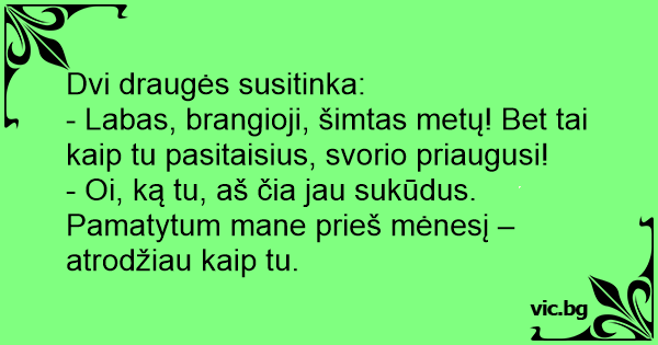- Labas, brangioji, šimtas metų! Bet tai kaip tu pasitaisius, svorio priaugusi!