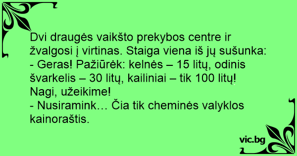 Dvi draugės vaikšto prekybos centre ir žvalgosi į virtinas. Staiga viena iš jų sušunka: