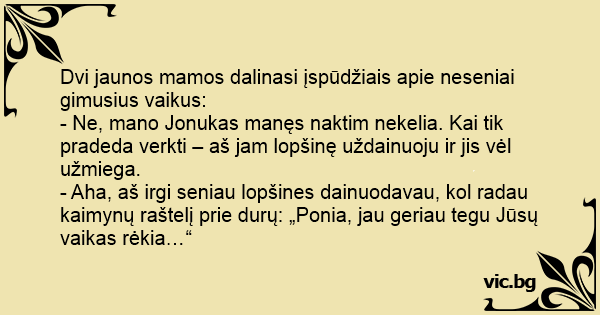 - Ne, mano Jonukas manęs naktim nekelia. Kai tik pradeda verkti – aš jam lopšinę uždainuoju ir jis vėl užmiega.