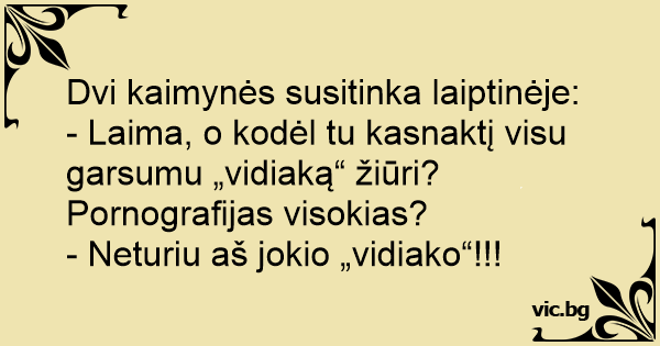 - Laima, o kodėl tu kasnaktį visu garsumu „vidiaką“ žiūri? Pornografijas visokias?