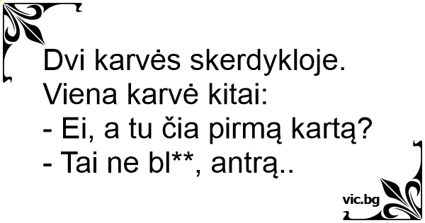 Dvi karvės skerdykloje. Viena karvė kitai: - Ei, a tu čia pirmą kartą? - Tai ne bl**, antrą..