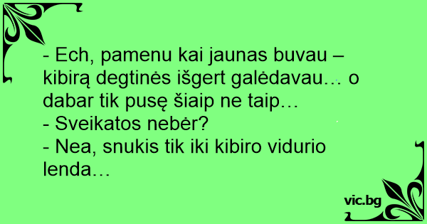 - Ech, pamenu kai jaunas buvau – kibirą degtinės išgert galėdavau… o dabar tik pusę šiaip ne taip…