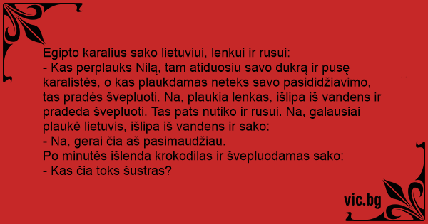 - Kas perplauks Nilą, tam atiduosiu savo dukrą ir pusę karalistės, o kas plaukdamas neteks savo pasididžiavimo, tas pradės švepluoti. Na, plaukia lenkas, išlipa iš vandens ir pradeda švepluoti. Tas pats nutiko ir rusui. Na, galausiai plaukė lietuvis, išlipa iš vandens ir sako: