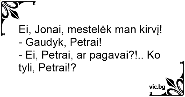 Ei, Jonai, mestelėk man kirvį!- Gaudyk, Petrai!- Ei, Petrai, ar pagavai?!.. Ko tyli, Petrai!? 1 0 0 Anekdotai