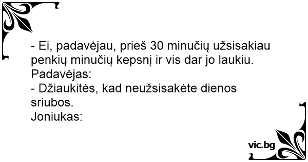 - Ei, padavėjau, prieš 30 minučių užsisakiau penkių minučių kepsnį ir vis dar jo laukiu.