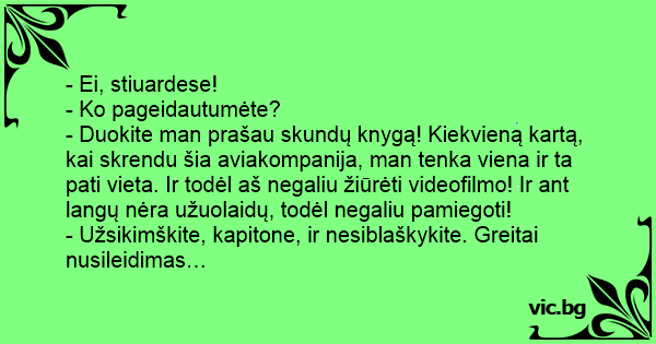 - Duokite man prašau skundų knygą! Kiekvieną kartą, kai skrendu šia aviakompanija, man tenka viena ir ta pati vieta. Ir todėl aš negaliu žiūrėti videofilmo! Ir ant langų nėra užuolaidų, todėl negaliu pamiegoti!