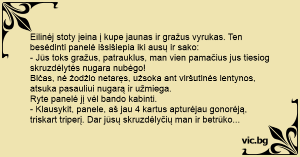 Eilinėj stoty įeina į kupe jaunas ir gražus vyrukas. Ten besėdinti panelė išsišiepia iki ausų ir sako: