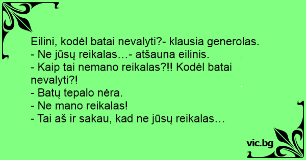 Eilini, kodėl batai nevalyti?- klausia generolas.