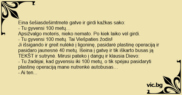 - Tu žadėjai, kad gyvensiu iki 100 metų, o tik spėjau pasidaryti plastinę operaciją mane nutrenkė autobusas…