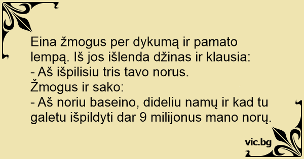 Eina žmogus per dykumą ir pamato lempą. Iš jos išlenda džinas ir klausia: