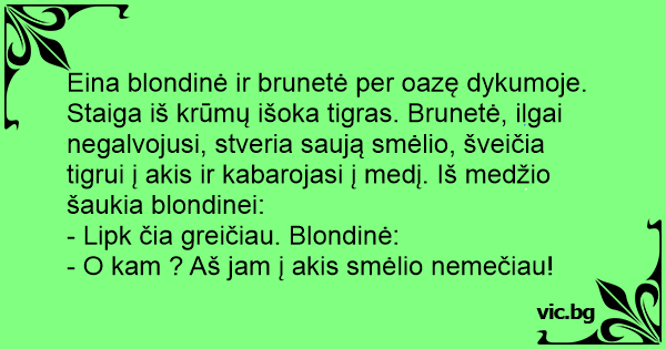 Eina blondinė ir brunetė per oazę dykumoje. Staiga iš krūmų išoka tigras. Brunetė, ilgai negalvojusi, stveria saują smėlio, šveičia tigrui į akis ir kabarojasi į medį. Iš medžio šaukia blondinei: