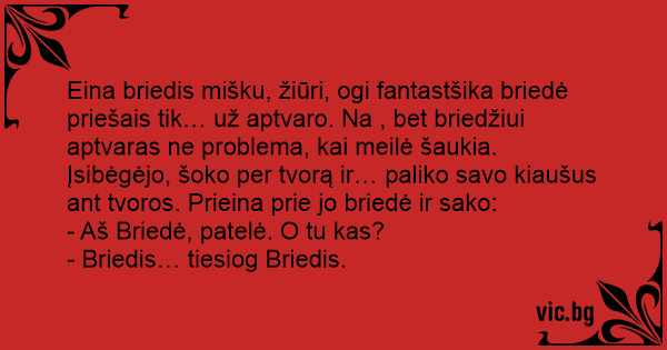 Eina briedis mišku, žiūri, ogi fantastšika briedė priešais tik… už aptvaro. Na , bet briedžiui aptvaras ne problema, kai meilė šaukia. Įsibėgėjo, šoko per tvorą ir… paliko savo kiaušus ant tvoros. Prieina prie jo briedė ir sako:
