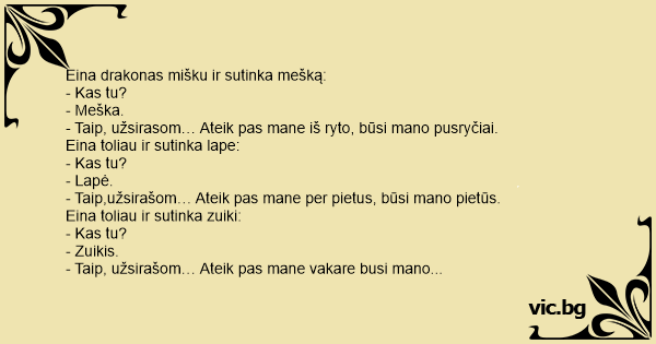 Eina kartą drakonas per mišką. Linksmas švilpauja. Sutinka mešką: - Tu kas? - Meška. Drakonas išsitraukia užrašų knygutę ir sako: - Taip, užsirašom – meš-ka. Ateisi pas mane ryt ryte, aš tave...